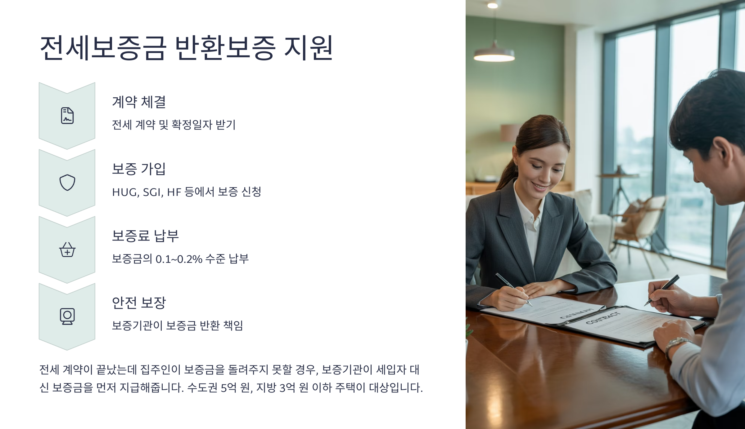 이 제도는 보증기관이 세입자 대신 보증금을 돌려주는 제도예요. 즉, 집주인이 전세금을 제때 반환하지 않더라도 보증기관에서 먼저 지급해주고, 이후 집주자에게 구상권을 청구하게 돼요.