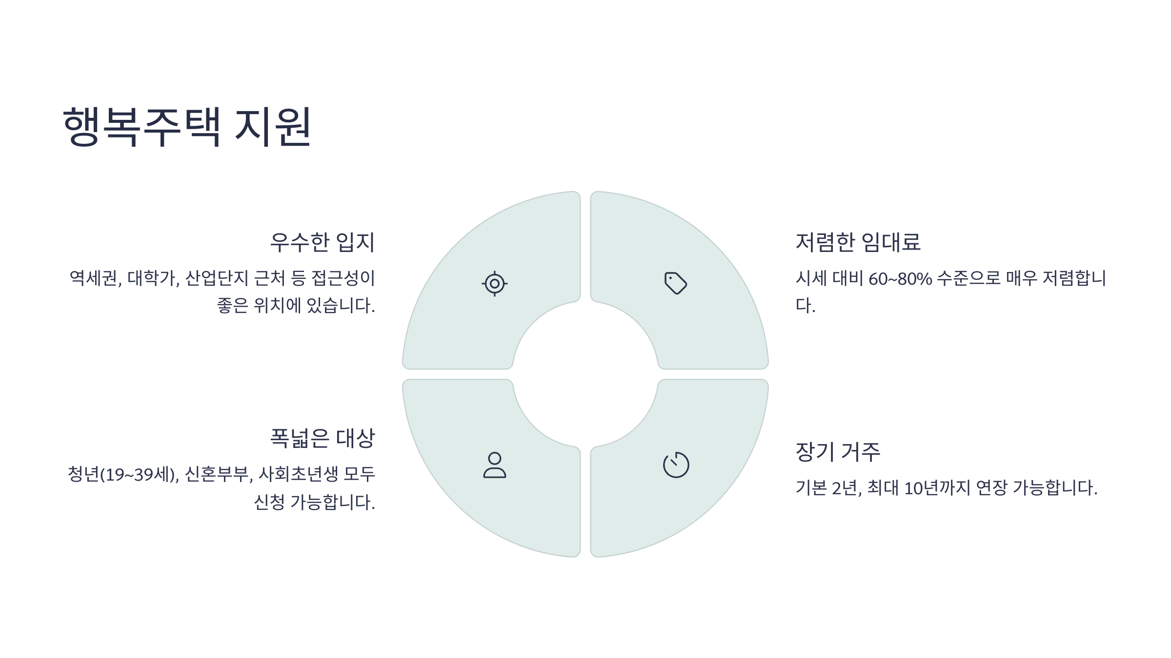 행복주택은 청년, 사회초년생, 신혼부부, 한부모가구, 고령자, 주거급여 수급자 등 다양한 계층을 대상으로 하고 있어요. 입주 자격과 임대료는 공급 시기마다 조금씩 다르지만, 공통적으로 시세 대비 60~80% 수준으로 매우 저렴해요.