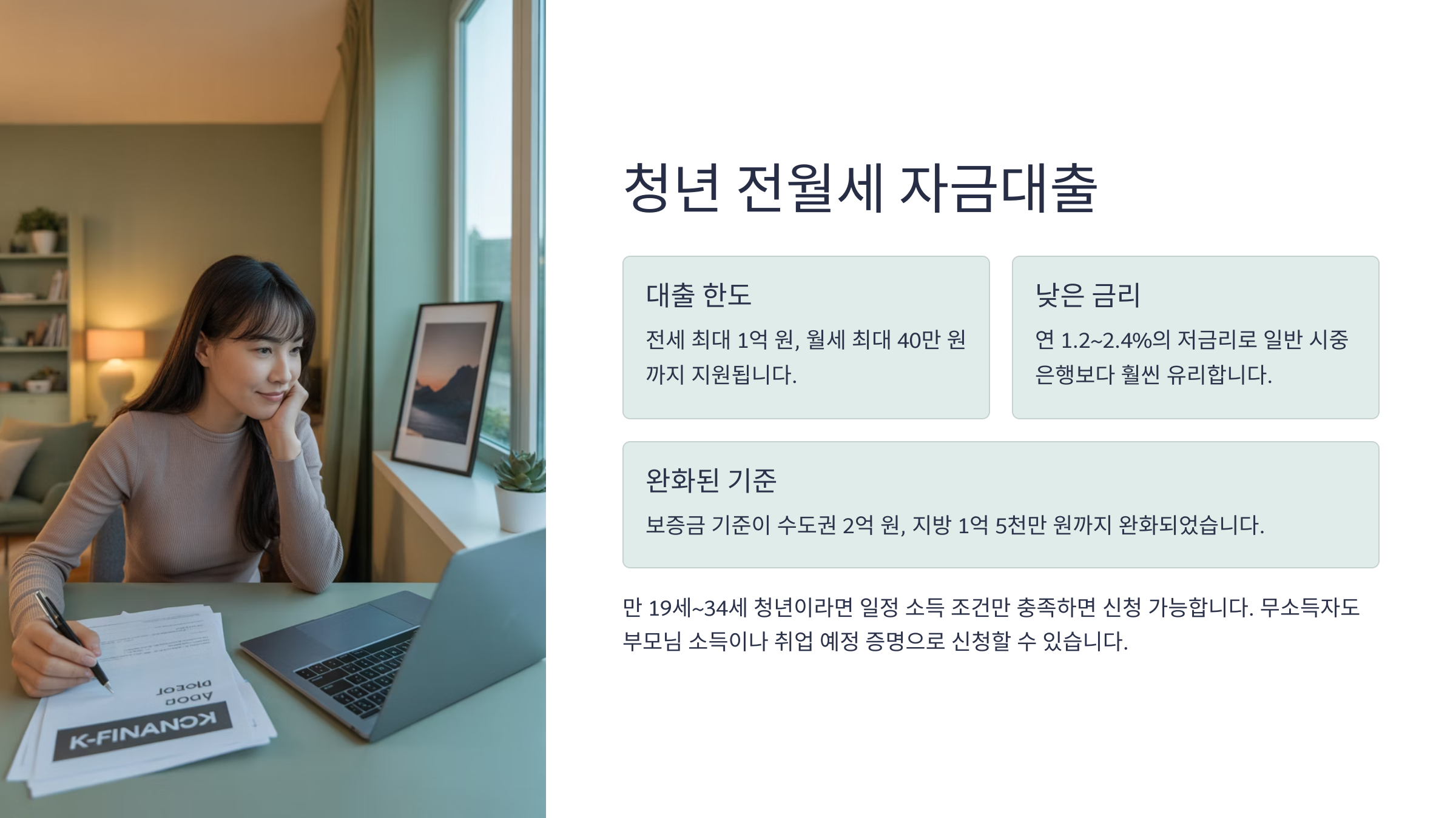 | 대출 한도 | 전세 1억 원 / 월세 40만 원 |