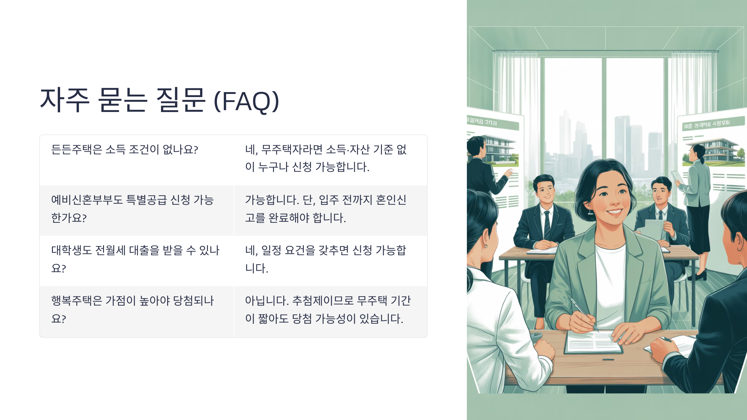 A1. 맞아요. 든든주택은 소득·자산 기준 없이 무주택자라면 누구나 신청할 수 있어요.