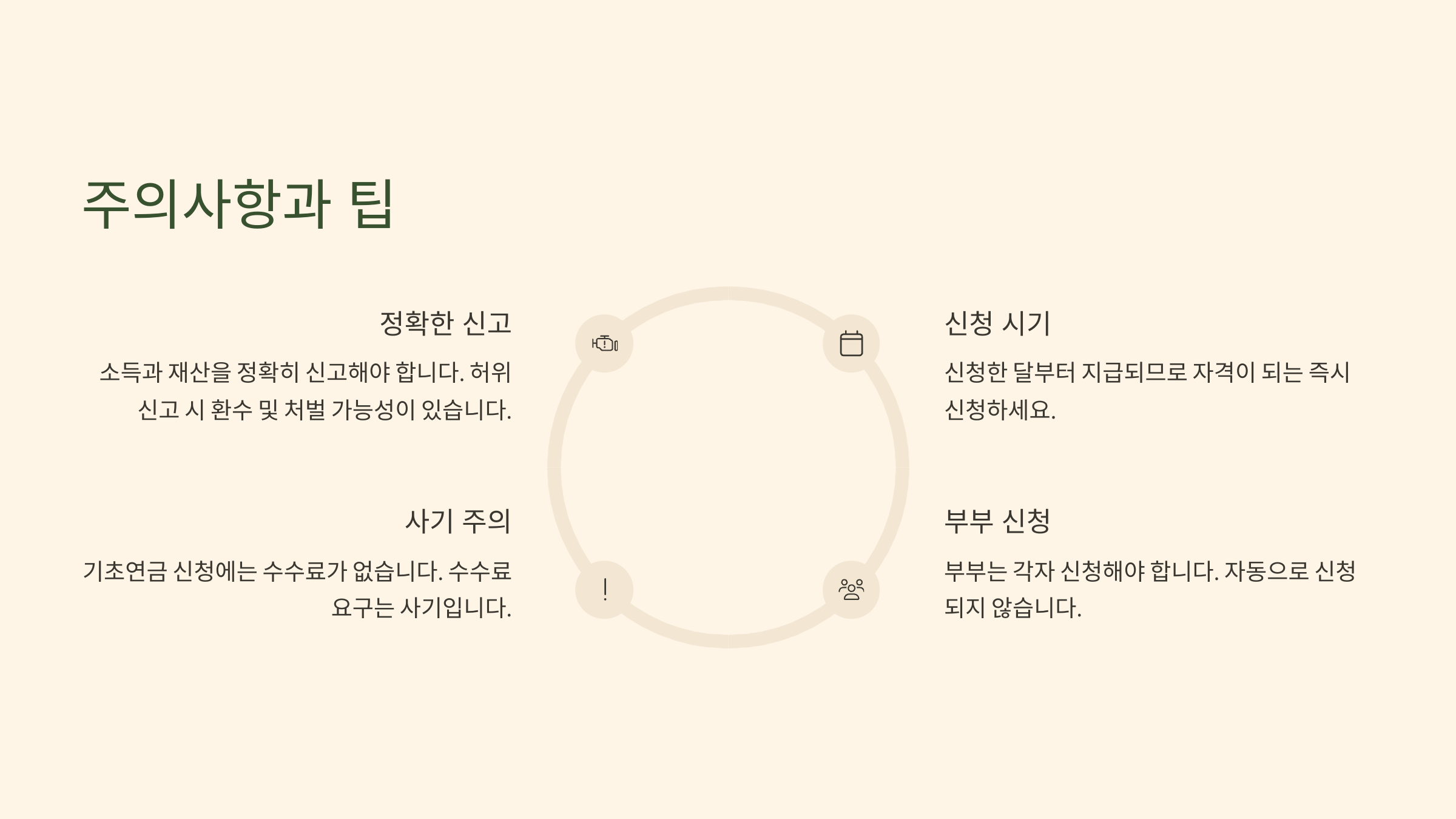 기초연금 신청과 관련해서 주의해야 할 점들이 몇 가지 있어요. 가장 중요한 것은 정확한 소득과 재산 신고예요. 일부러 숨기거나 허위로 신고하면 나중에 발각되어 큰 문제가 될 수 있어요. 환수 조치뿐만 아니라 법적 처벌까지 받을 수 있으니 반드시 정직하게 신고해야 해요. 또한 소득이나 재산에 변동이 생기면 즉시 신고하는 것이 좋아요. 🚨