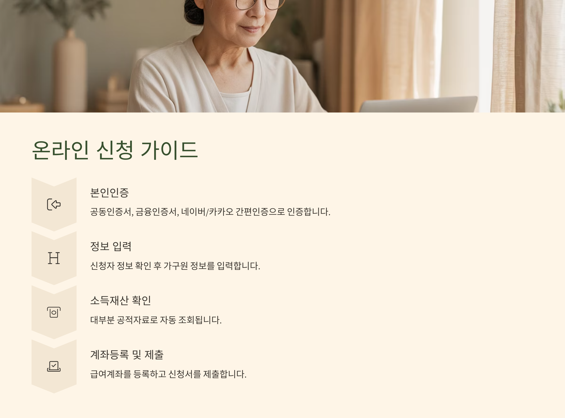 온라인 신청 과정은 단계별로 안내되어 따라하기만 하면 돼요. 먼저 신청자 정보를 확인하고, 가구원 정보를 입력한 후, 소득과 재산 정보를 확인해요. 마지막으로 급여계좌를 등록하고 신청서를 제출하면 끝이에요. 전체 과정이 10-15분 정도면 완료될 수 있어 정말 간편해요. 📱