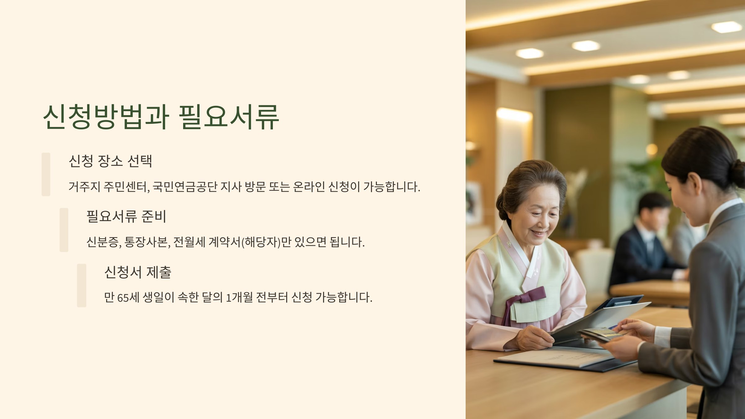신청 시기도 중요한 포인트예요. 기초연금은 신청한 달부터 지급되기 때문에 자격이 되는 즉시 신청하는 것이 좋아요. 늦게 신청하면 그만큼 받을 수 있는 기간이 줄어들어 손해예요. 만 65세 생일 한 달 전부터 신청할 수 있으니 미리 준비해서 생일이 되자마자 받을 수 있도록 하세요. ⏰