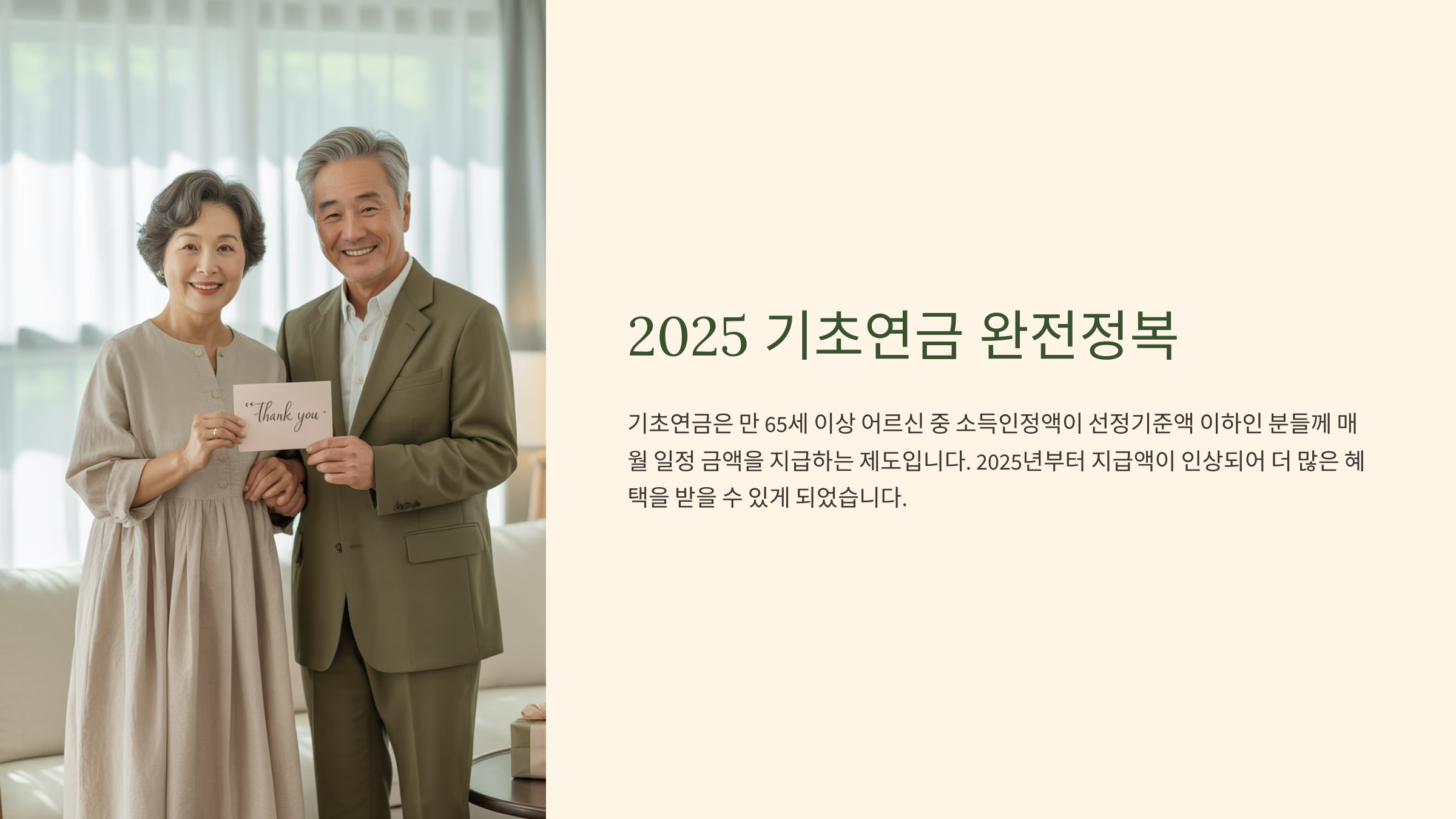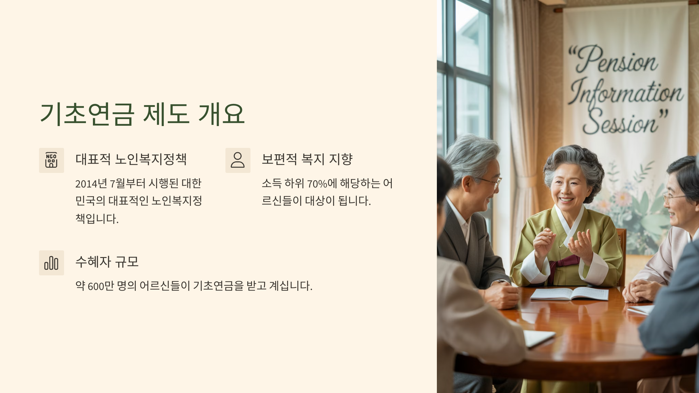 2025년 기초연금은 어르신들의 안정적인 노후 생활을 위한 가장 중요한 사회보장제도예요. 만 65세 이상 어르신 중에서 소득인정액이 선정기준액 이하인 분들께 매월 일정 금액을 지급하는 제도랍니다. 올해부터는 지급액이 인상되어 더 많은 분들이 혜택을 받을 수 있게 되었어요.