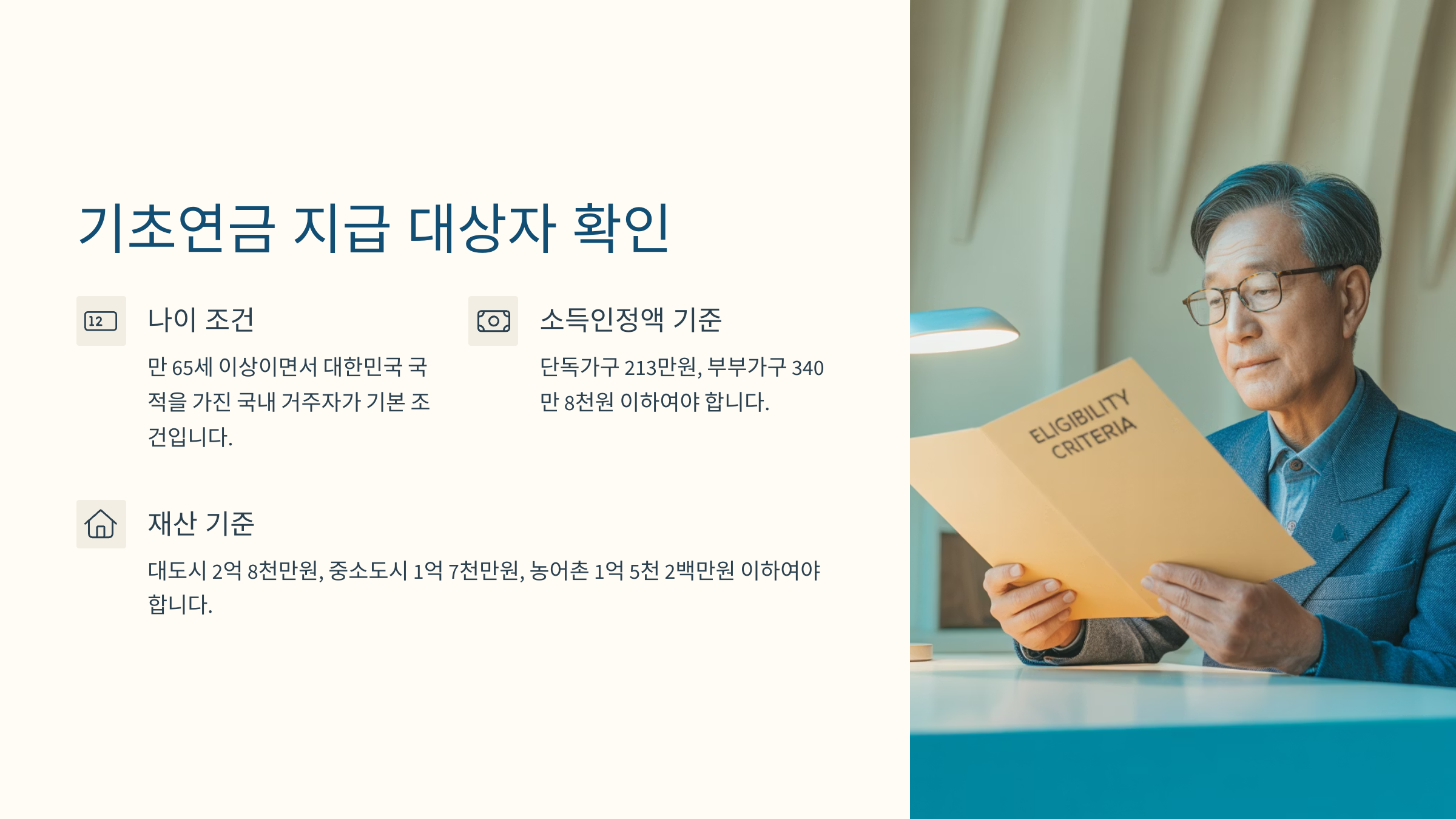 기초연금을 받기 위해서는 가장 먼저 나이와 소득 조건을 확인해야 해요. 만 65세 이상이면서 대한민국 국적을 가진 국내 거주자가 기본 조건이에요. 외국인의 경우 국내 거주 기간이 10년 이상이어야 하고, 난민 인정자나 영주권자도 포함된답니다. 나이 확인은 주민등록상 생년월일을 기준으로 하며, 65세가 되는 달부터 신청할 수 있어요.