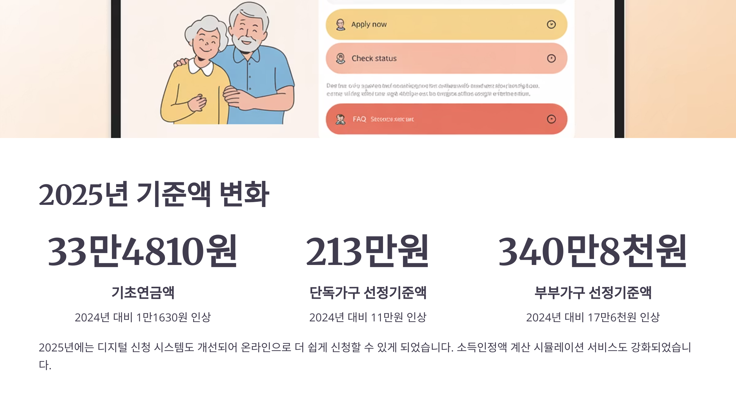2025년 변경사항으로 더 많은 어르신들이 기초연금 혜택을 받을 수 있게 되었어요. 특히 소득이 경계선에 있던 분들은 다시 신청해보시는 게 좋을 것 같아요. 📅