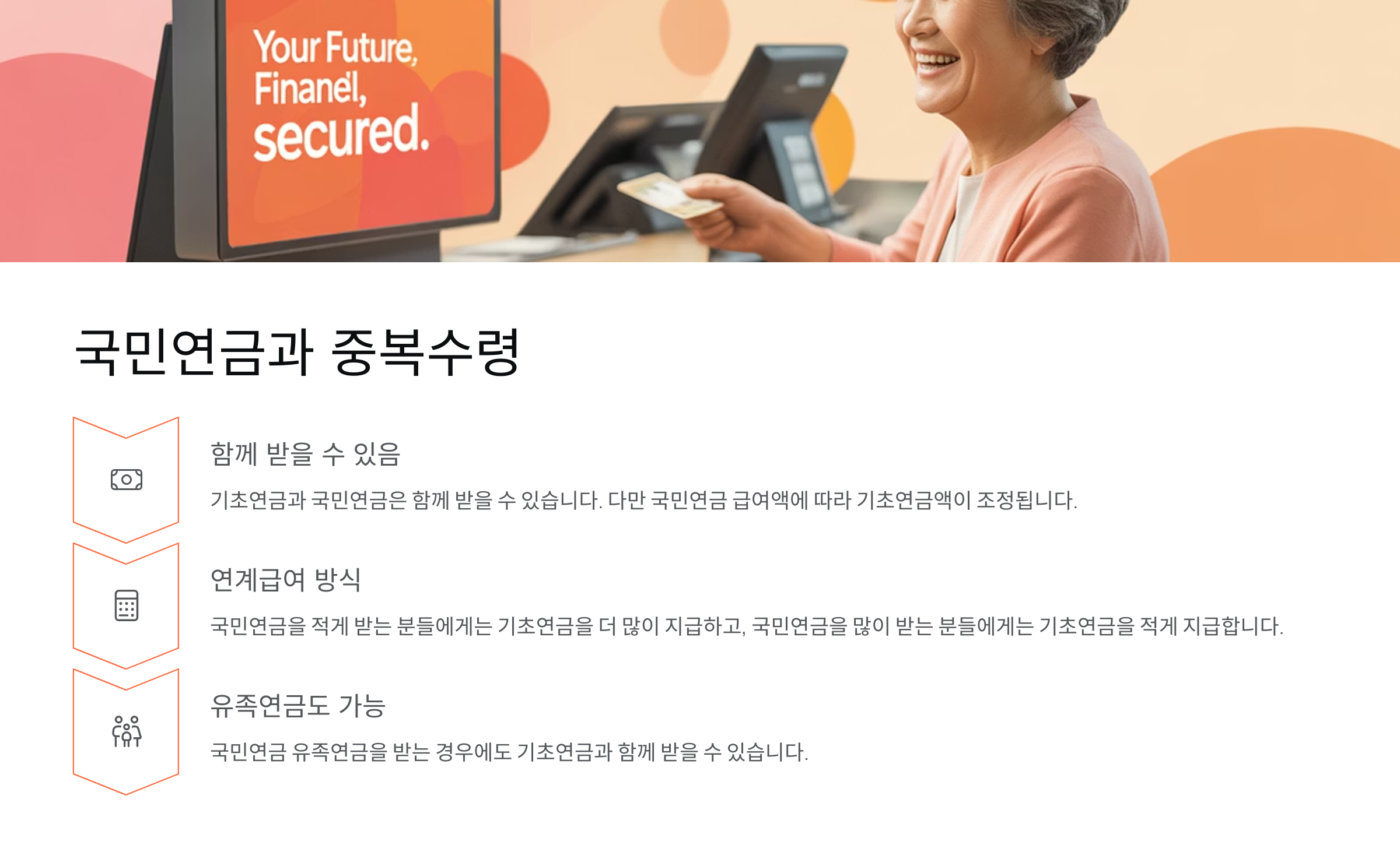 국민연금 유족연금을 받는 경우에도 기초연금과 함께 받을 수 있어요. 유족연금은 사망한 배우자의 국민연금 수급권을 승계받는 것이므로, 생존 배우자가 65세 이상이고 소득인정액이 기준 이하라면 기초연금을 별도로 받을 수 있답니다. 다만 유족연금액이 많은 경우에는 기초연금이 감액될 수 있어요. 또한 본인의 국민연금과 배우자의 유족연금을 모두 받는 경우에는 두 연금을 합산해서 기초연금액을 조정하게 돼요.