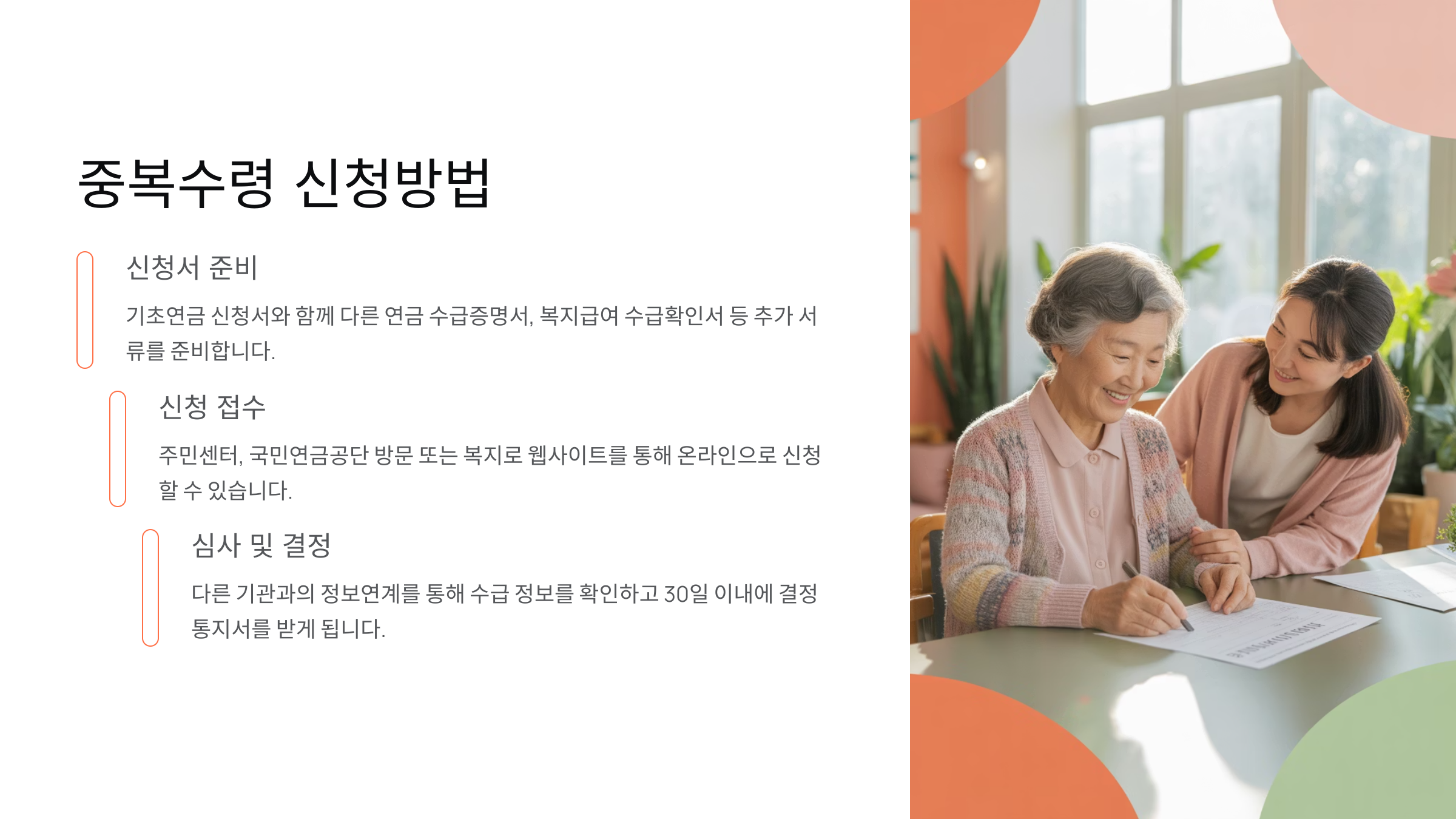 기초연금 중복수령 신청은 기본적으로 기초연금 신청과 동일한 절차를 따라요. 주민센터나 국민연금공단에 방문해서 신청하거나, 복지로 웹사이트를 통해 온라인 신청이 가능하답니다. 다만 다른 연금을 이미 받고 있는 경우에는 추가 서류가 필요할 수 있어요. 국민연금 수급자는 국민연금 수급증명서를, 직역연금 수급자는 해당 연금의 수급증명서를 준비해야 해요. 또한 복지급여를 받고 있는 경우에는 그 급여의 수급확인서도 함께 제출하셔야 해요.