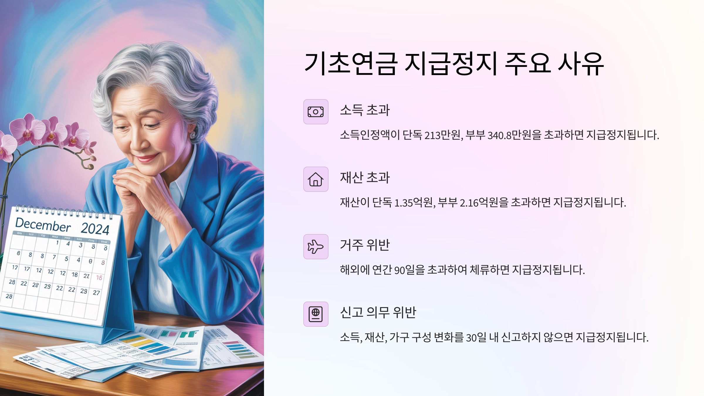 기초연금 지급정지 사유는 크게 5가지로 나뉘어요. 첫 번째는 소득인정액 초과예요. 근로소득이나 사업소득, 재산소득이 늘어나서 선정 기준을 넘으면 지급이 정지돼요. 2025년 기준으로 단독가구는 월 소득인정액이 213만원을 넘으면, 부부가구는 340만 8천원을 넘으면 정지되는 거예요. 이때 소득인정액은 실제 소득과 재산을 소득으로 환산한 금액을 합친 것이므로 단순히 근로소득만으로 판단하면 안 돼요. 재산이 많으면 소득이 적어도 기준을 넘을 수 있거든요.