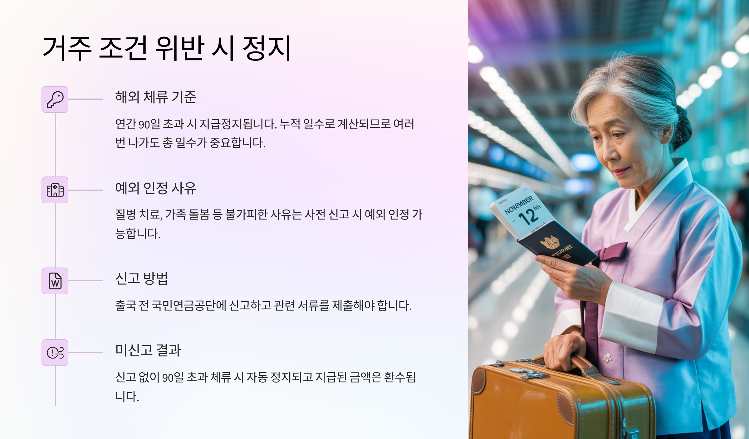거주 조건 위반으로 인한 기초연금 지급정지는 최근 들어 자주 발생하고 있어요. 가장 흔한 경우는 해외에 연간 90일을 초과해서 체류하는 것이에요. 자녀들이 해외에 거주해서 함께 살기 위해 장기간 출국하시거나, 치료나 요양을 위해 해외에 나가시는 경우가 많아지고 있어요. 90일 기준은 연간 누적일수로 계산되므로 여러 번 나누어서 나가더라도 총 일수가 90일을 넘으면 정지 대상이 돼요. 다만 질병 치료, 가족 돌봄, 연구 활동 등 불가피한 사유가 있는 경우에는 사전 신고를 통해 예외 인정을 받을 수 있어요.