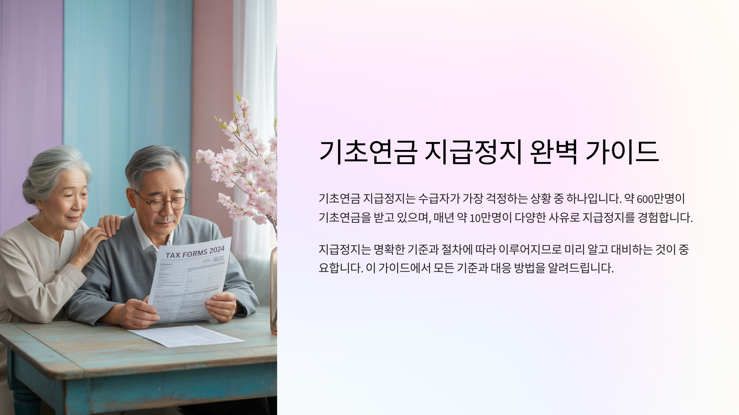 기초연금 지급정지는 수급자가 가장 걱정하는 상황 중 하나예요. 2025년 현재 약 600만명이 기초연금을 받고 있는데, 매년 약 10만명 정도가 다양한 사유로 지급정지를 경험하고 있어요. 지급정지는 갑작스럽게 일어나는 것이 아니라 명확한 기준과 절차에 따라 이루어지므로 미리 알고 대비하는 것이 중요해요. 가장 흔한 지급정지 사유는 소득 증가, 재산 증가, 해외 장기 체류, 신고 의무 위반 등이 있답니다.