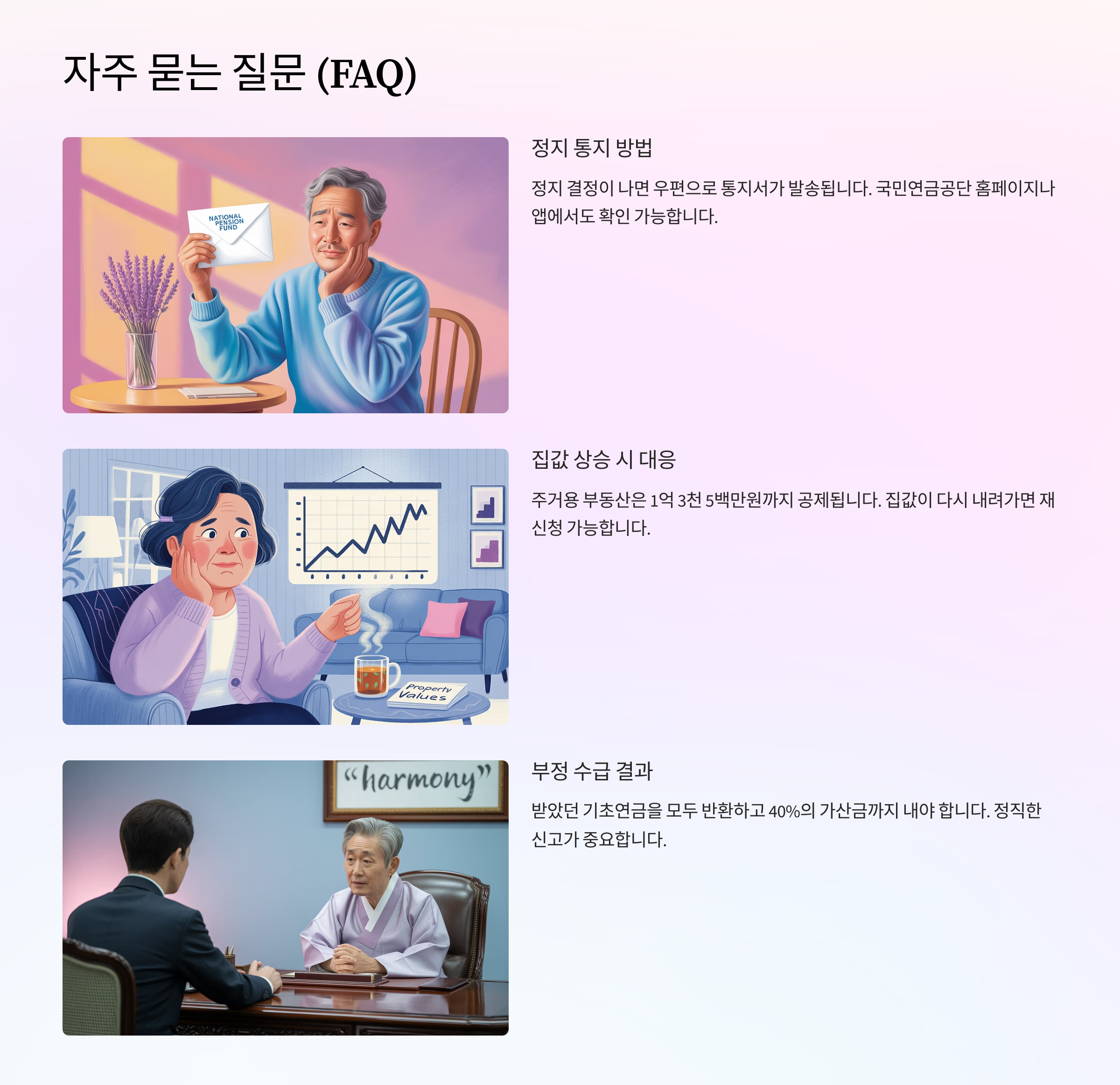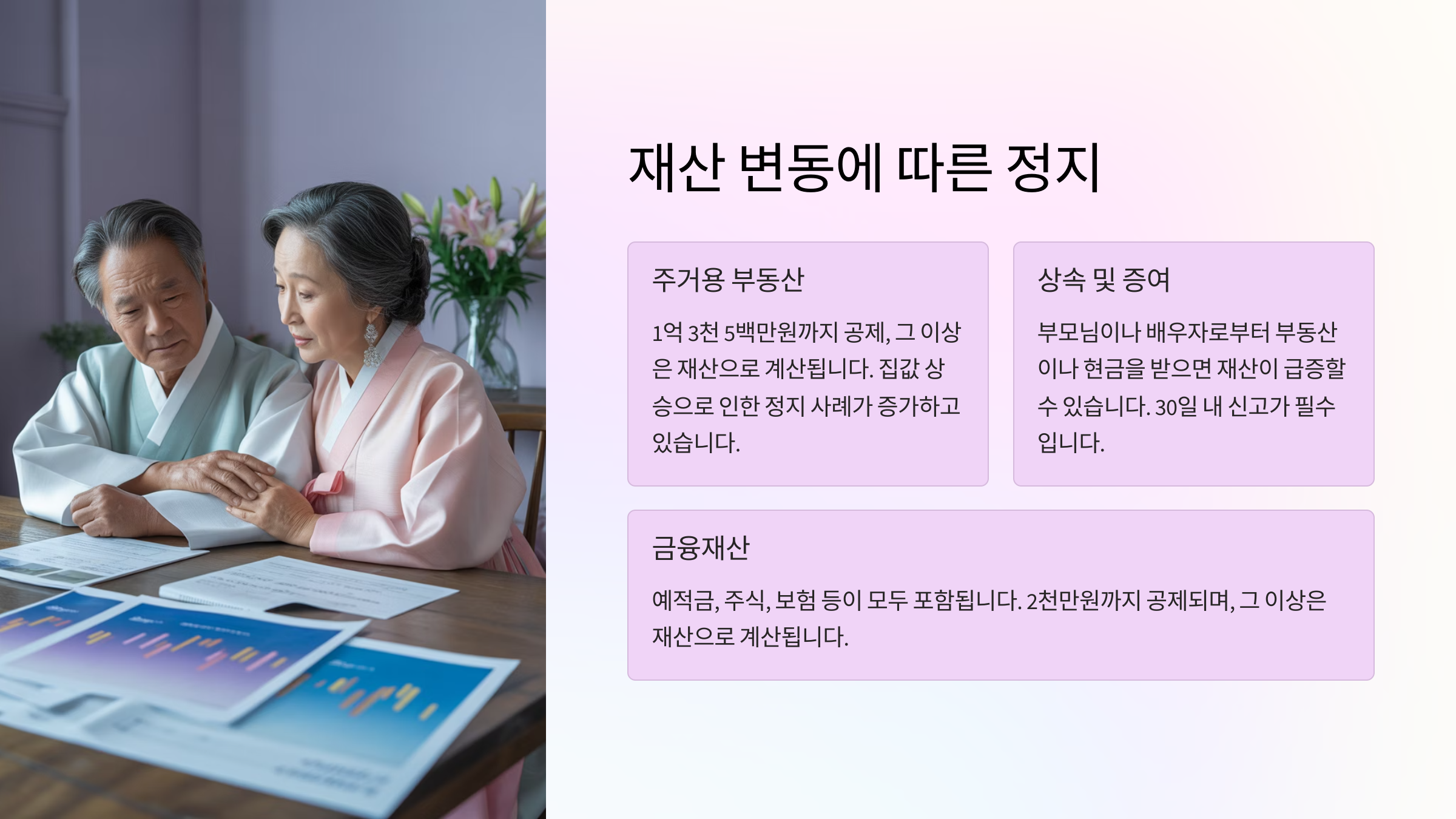 두 번째는 재산 기준 초과예요. 부동산이나 금융재산, 자동차 등의 가액이 기준을 넘으면 지급이 정지돼요. 단독가구는 1억 3천 5백만원, 부부가구는 2억 1천 6백만원이 기준이에요. 특히 부동산 가격이 급등하는 지역에 사시는 분들은 집값이 올라서 기준을 넘는 경우가 종종 있어요. 상속이나 증여를 받아서 갑자기 재산이 늘어나는 경우도 마찬가지예요. 이런 경우에는 30일 이내에 신고해야 하는데, 신고하지 않으면 부정 수급으로 처리될 수 있어요.