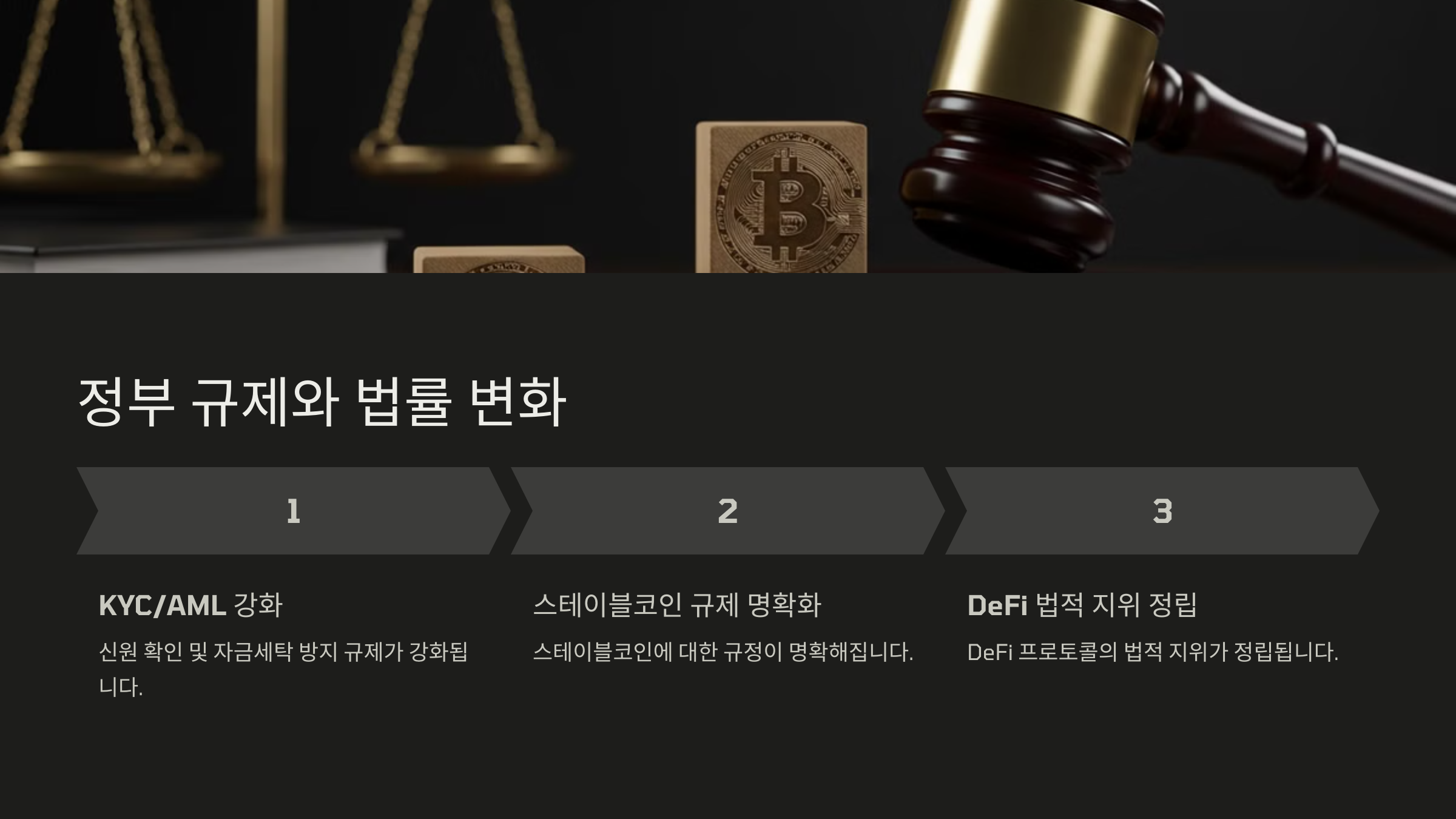 | ⚖️ 규제 강화 | 각국 정부의 암호화폐 규제 본격화, 세금 정책 변화 |