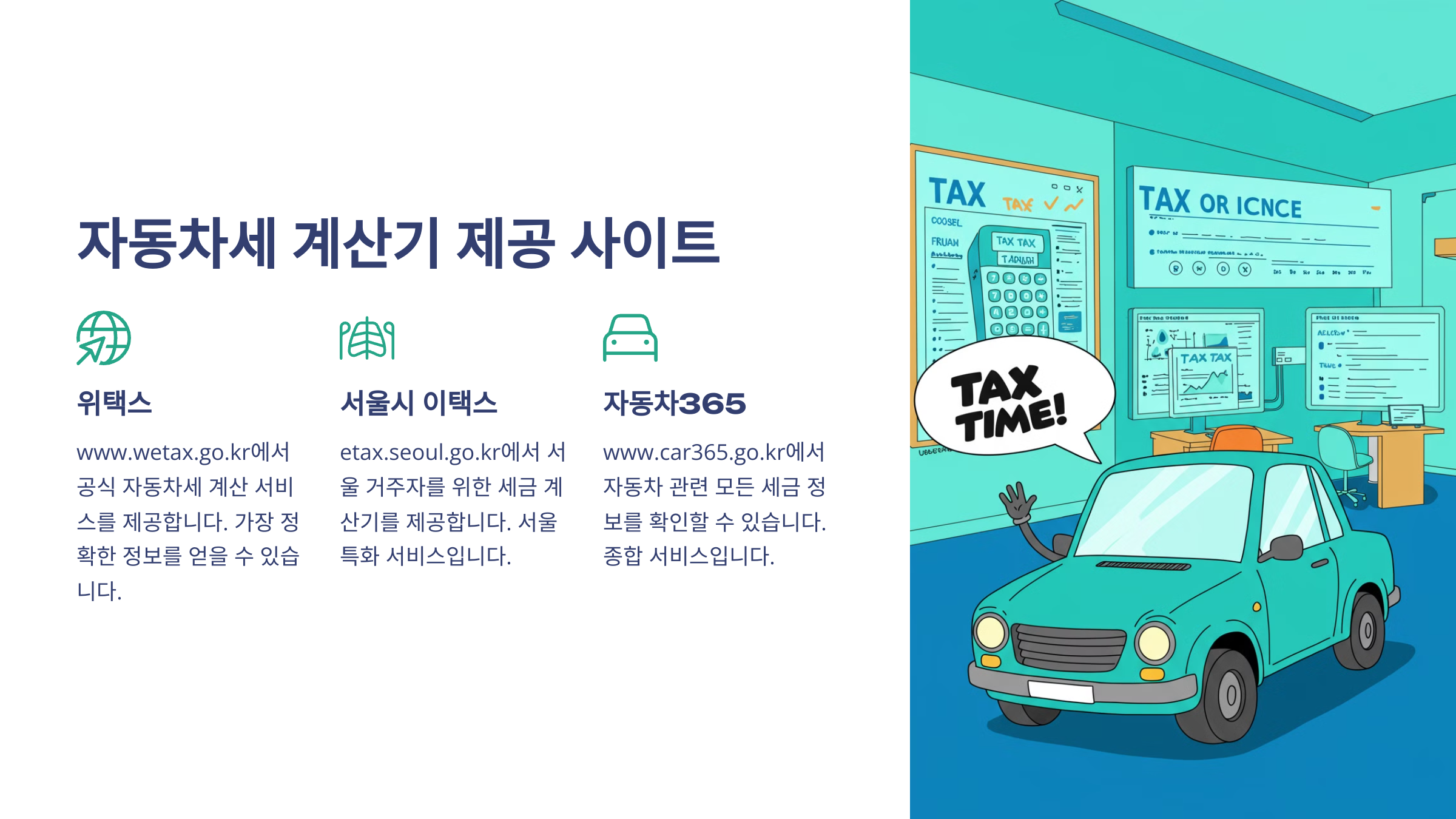 자동차세 계산기는 위택스(Wetax), 각 지방자치단체 홈페이지, 자동차 관련 포털에서 무료로 이용할 수 있어요. 사용 방법도 매우 간단해요! 😊