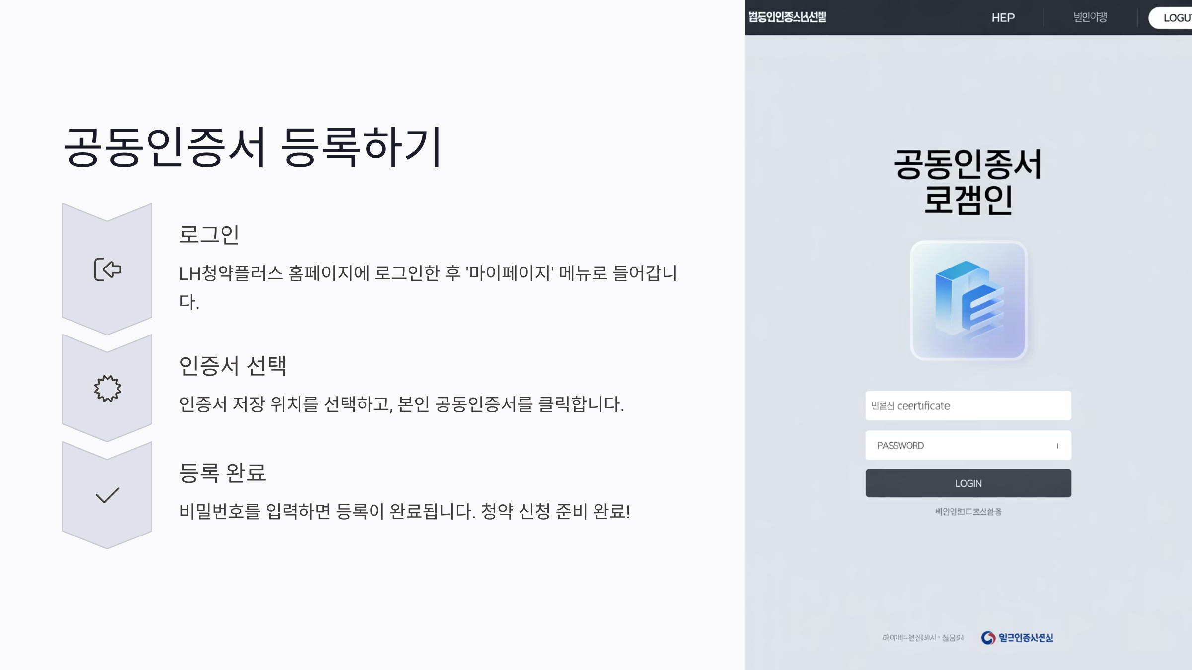 | STEP 2 | 공동인증서 선택 → 비밀번호 입력 |